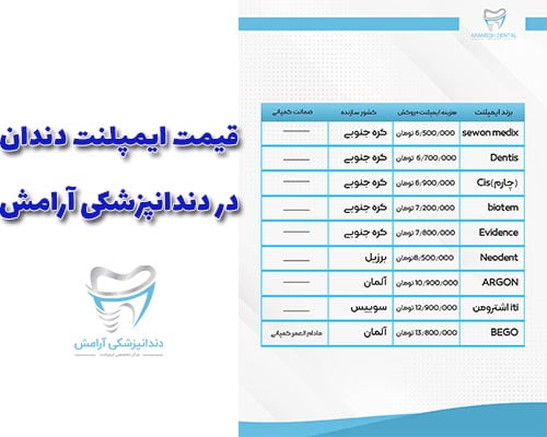 هزینه ایمپلنت دندان در دندانپزشکی تخصصی آرامش از مبلغ 7 میلیون تا 13 میلیون فرق میکند ایمپلنت اویدنس (Evidence)